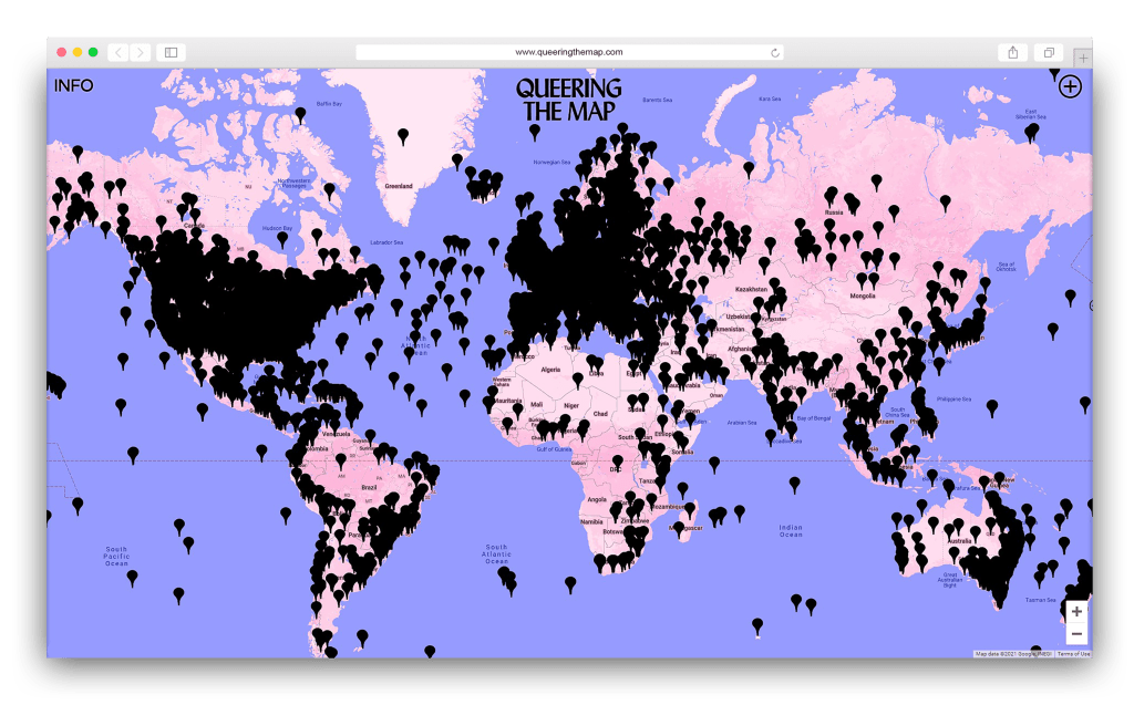 Queering the Map is an innovative online story-mapping platform and cartographic archive. Visitors anonymously pin their experiences, memories and histories to an online global map, and each pin contains a unique micro-story of queerness: the meaningful and mundane experiences of LGBTQIA+ life. These pins form a living archive, collectively building, mapping and creating space for a form of queer community across the globe.